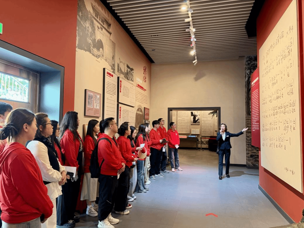 在讲解员的带领下,大家依次参观了纪念馆主展厅和词曲创作旧址,深入了解了1943年曹火星在此创作歌曲《没有共产党就没有新中国》的历史背景以及它的传播历程。参观过程中,同学们齐唱《国际歌》《没有共产党就没有新中国》等红色歌曲,气氛热烈。通过铿锵有力的歌词,同学们真切感受到革命文艺工作者在艰苦岁月中扎根人民、讴歌信仰的崇高精神。