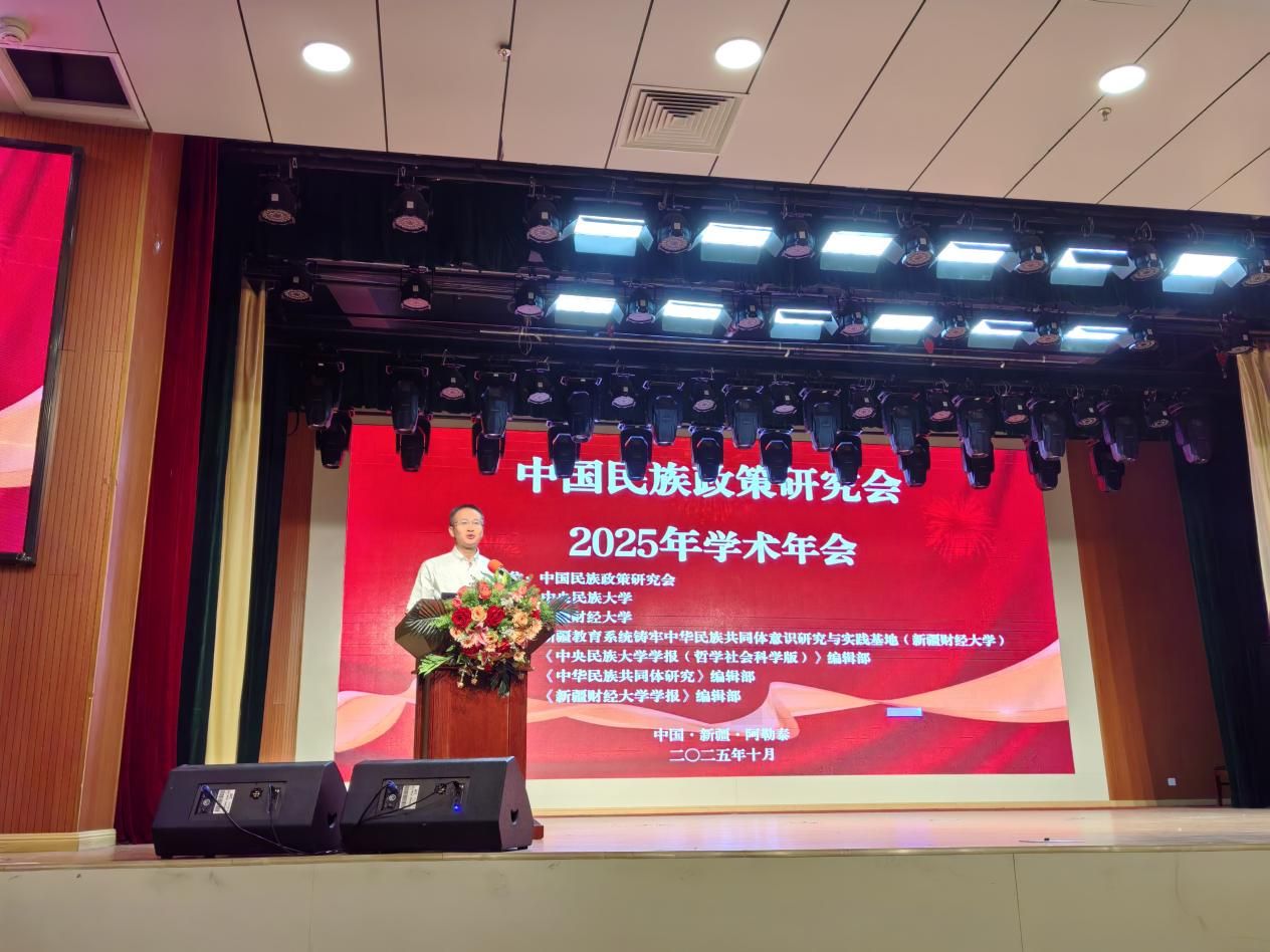 2025年10月10日-12日,中国民族政策研究会2025年学术年会在新疆阿勒泰地区阿勒泰市新疆财经大学阿勒泰校区隆重举行。本次年会以“健全铸牢中华民族共同体意识制度机制”为主题,由中国民族政策研究会、中央民族大学联合主办,新疆财经大学、新疆维吾尔自治区教育系统铸牢中华民族共同体意识研究与实践基地(新疆财经大学)共同承办,来自全国高校、科研院所、民族工作部门的百余名专家学者齐聚一堂,共研民族政策学术前沿。