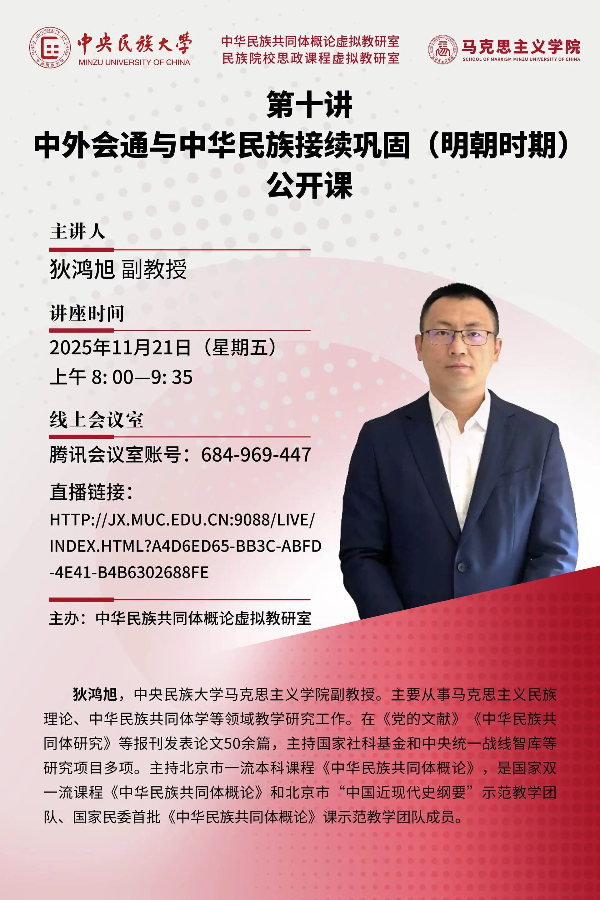 狄鸿旭,中央民族大学马克思主义学院副教授。主要从事马克思主义民族理论、中华民族共同体学等领域教学研究工作。在《党的文献》《中华民族共同体研究》等报刊发表论文50余篇,主持国家社科基金和中央统一战线智库等研究项目多项。主持北京市一流本科课程《中华民族共同体概论》,是国家双一流课程《中华民族共同体概论》和北京市“中国近现代史纲要”示范教学团队、国家民委首批《中华民族共同体概论》课示范教学团队成员。